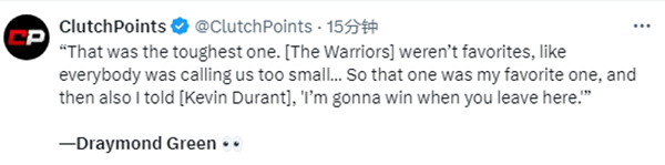 追梦还表示:我还曾跟杜兰特说过,你走之后我还会夺冠,我做到了,所以,那是我最爱的一个冠军。