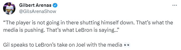 前NBA球员阿里纳斯则表示:球员们不会自己不让自己打比赛的。这(恩比德带伤出战)都是媒体推动的,这就是勒布朗的意思。你们媒体推动恩比德去打够65场比赛。