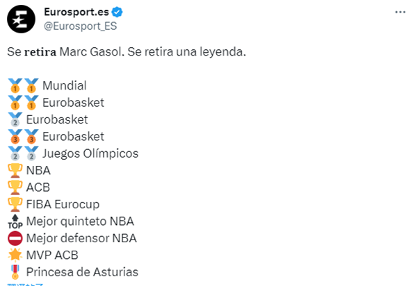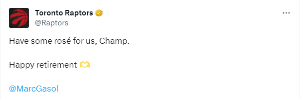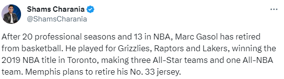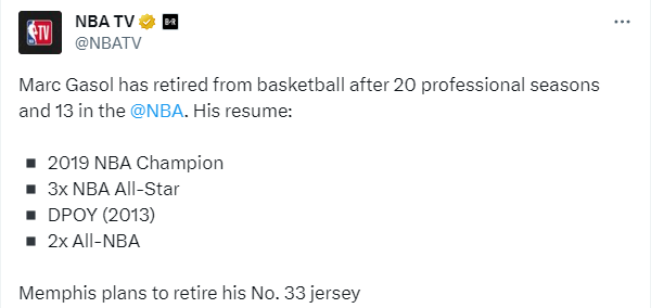 24直播网02月01日讯 ,西班牙篮坛巨星马克-加索尔正式宣布退役,结束20年职业生涯,13年NBA生涯先后为灰熊、猛龙和湖人三队效力,3次入选全明星、1次夺得年度最佳防守球员以及2019年在猛龙实现冠军梦;据报道,灰熊计划退役他的33号球衣。