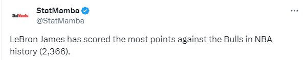 据统计,詹姆斯生涯对阵公牛累计得到2366分,为历史上任何NBA球员对阵公牛的得分纪录;换言之,詹姆斯已经成为历史上对阵公牛得分最多的球员。