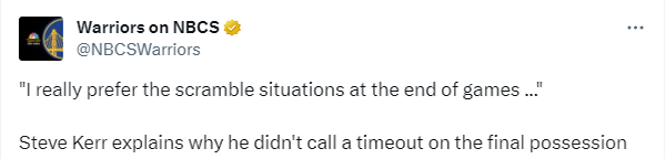 为何科尔最后时刻不喊暂停?赛后勇士主帅科尔解释道:我信任这些家伙,一旦我们把球传给库里,追梦格林进行挡拆,这就是我们长期以来所做的事情,他们已经在一起很长时间了。我真的更喜欢比赛最后时刻的混乱局面,那时防守方不能设定战术或者进行换人。今晚这样的结局就是那种让你夜不能寐的情况。