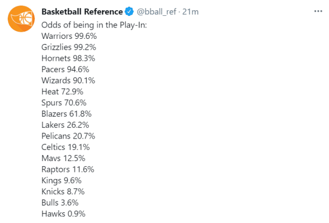24直播网讯 北京时间5月7日,知名数据网站Basketball-Reference公布了2021年NBA球队参加附加赛的概率,17支球队出现在榜单上。参加附加赛概率最大的球队是勇士,达到99.6%,几乎是锁定了附加赛的其中一个名额。目前排在西部第六的湖人,在榜单上位列第九,他们有26.2%的概率打附加赛。