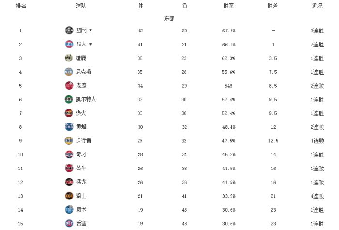 24直播网讯 今天NBA常规赛东部球队的比赛已经都结束了,东部的格局也发生了很大的变化,费城成为继篮网之后东部第二支、联盟第三支锁定季后赛席位的球队;猛龙输球奇才爆冷击败湖人,这样奇才稳居前十;热火击败马刺,这样东部卡位战的竞争也是相当激烈的。接下来我们看下东部的最新格局: