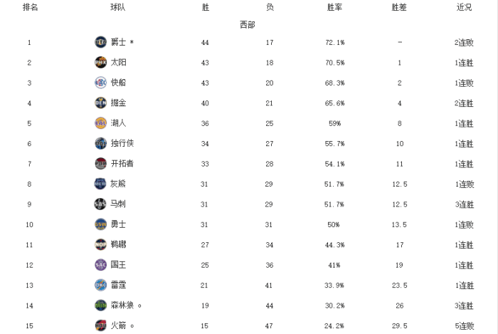 西部1-8名:爵士、太阳、快船、掘金、湖人、独行侠、开拓者、灰熊;