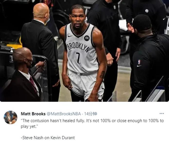 杜兰特的伤情出现了反复吗?篮网队主教练纳什在接受采访的时候表示:杜兰特的大腿挫伤还没有痊愈,目前杜兰特的伤病还没有达到100%痊愈或者接近100%痊愈,处于安全考虑,篮网队选择让杜兰特继续休战。