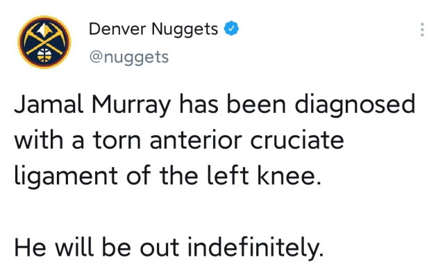 24直播网讯北京时间4月14日,掘金官方宣布,后卫贾马尔-穆雷遭遇左膝前十字韧带撕裂的伤病,将无限期休战。名记查拉尼亚报道称,这一伤病将导致穆雷赛季报销。穆雷在对阵勇士比赛的最后时刻意外受伤,如今检查结果显示伤情严重。缺少了他这块重要的拼图,掘金本赛季的冲冠前景无疑是一片黯淡。