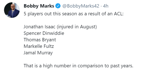 NBA专家鲍比-马克斯指出,本赛季已经有5名球员遭遇这一伤病,除了穆雷,还包括艾萨克(8月受伤)、丁威迪、托马斯-布莱恩特和富尔茨。对比往年,今年受伤的人数比较多。
