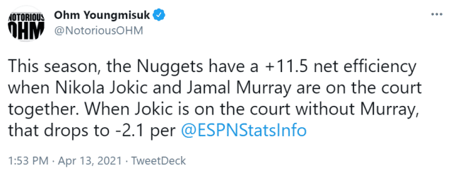 赛季至今,穆雷场均出战35.6分钟,排名联盟第8,能贡献21.3分4篮板4.8助攻1.3抢断,投篮命中率48%,三分命中率41.2%。值得一提的是约基奇和穆雷共同出场时,掘金净效率为+11.5,而约基奇在场穆雷不在场时,这一数据变成-2.1。穆雷的重要性由此可见一斑。