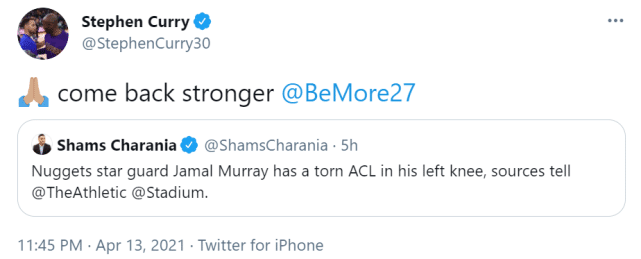 距离比赛结束还剩50.6秒时,穆雷突破上篮,落地时摔出底线。他痛苦地抱着自己的左膝,库里也在一旁单膝跪地,为穆雷祈祷。队医第一时间进场检查,工作人员也把轮椅推了进来。不过,穆雷拒绝坐上轮椅,而是在工作人员的搀扶下离场,他的左腿已经不能受力。掘金记者Mike Singer报道称,穆雷离开球馆后,第一时间被送往医院,并接受核磁共振检查。