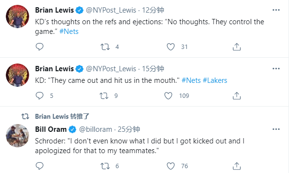 很明显,杜兰特对裁判驱逐欧文很不满,对于这件事,湖人球员施罗德也很疑惑,赛后他表示我们根本不知道发生了什么,但我被驱逐离场,对此我向队友们道歉。