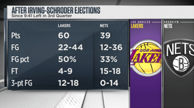第三节驱逐事件直接改变了比赛走势,湖人越打越带劲,篮网根本抵挡不住;据统计,在-欧文和施罗德第三节发生口角被驱逐后,湖人轰出了一波60-39的攻势;在此期间,湖人投篮44投22中,命中率50%,三分球18投12中,罚球9罚4中;篮网投篮36投12中,命中率33%,三分球14投0中,罚球18罚15中。