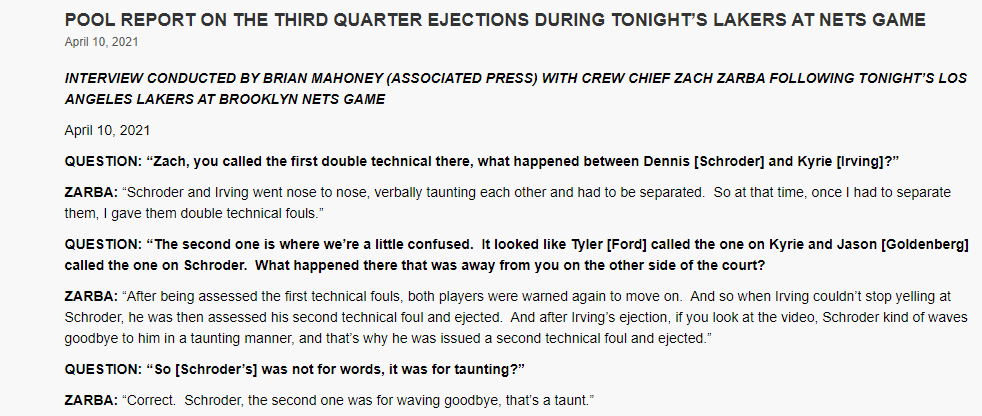 赛后本场比赛主裁判解释为何驱逐欧文和施罗德,这也就是联盟官方裁判报告。