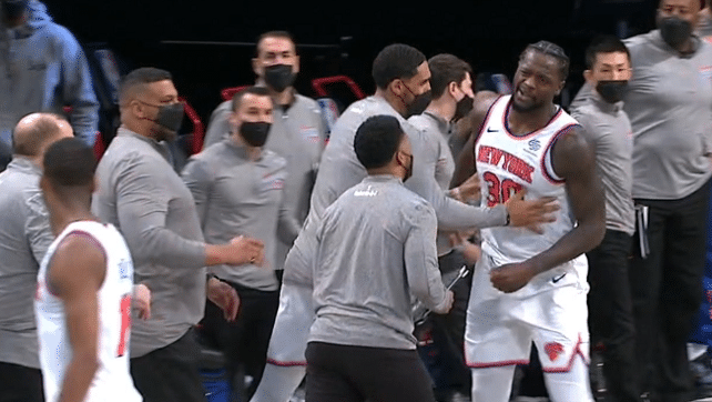 生气的兰德尔觉得欧文防守自己是有犯规的,不过裁判没有给回放,所以他想要在赛后找到裁判理论,不过被队友拉了回来。兰德尔还在回更衣室的路上踢翻了椅子,可见他有多么生气。而裁判最后时刻没有选择看回放,也是引发了争议。