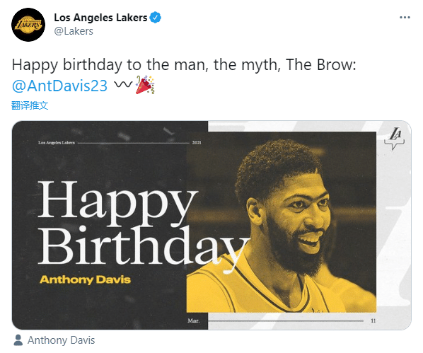 湖人官方发推写道:恭喜那个男人生日快乐,神话浓眉;湖人队还在官方Ins上晒出浓眉抱着总冠军奖杯的照片,再次祝贺浓眉生日快乐。