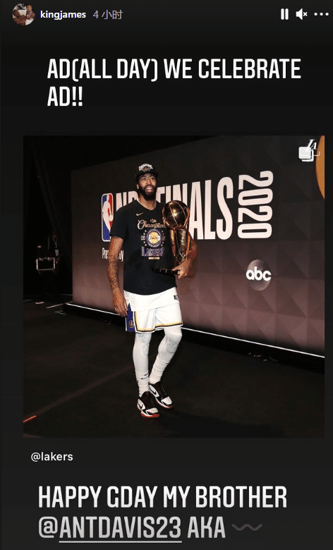 詹姆斯转发湖人官方动态,并且配文写道:AD(一整天)我们都要祝福AD!生日快乐,我的兄弟戴维斯,又名浓眉。