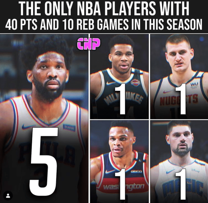 另外,大帝有一项数据统治力太强,赛季至今,恩比德已经5次轰下至少40分10板!可以看到,全联盟其他球员加起来一共只有4次,字母哥、约基奇、神龟、武切维奇这4人各一次。什么叫一人完胜全联盟?这个数据给出了最好的诠释!