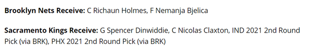 这笔交易方案的具体内容是篮网送出丁威迪、克拉克斯顿、步行者的2021年次轮签、太阳的2021年次轮签,得到国王的霍姆斯和别利察。