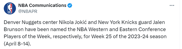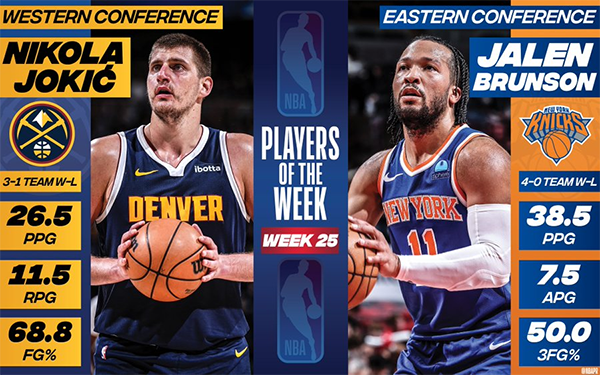 24直播网讯 北京时间4月16日,NBA官方公布了第25周,也是常规赛最后一周的周最佳球员。掘金的约基奇当选西部周最佳,这是约基奇生涯第14次当选周最佳(队史最多),也是本赛季第2次获得这一奖项。尼克斯的布伦森当选东部周最佳,这是布伦森生涯第5次当选周最佳,也是本赛季第4次获此殊荣。詹姆斯上周场均32.7分9篮板11助攻3抢断,获得周最佳的提名。