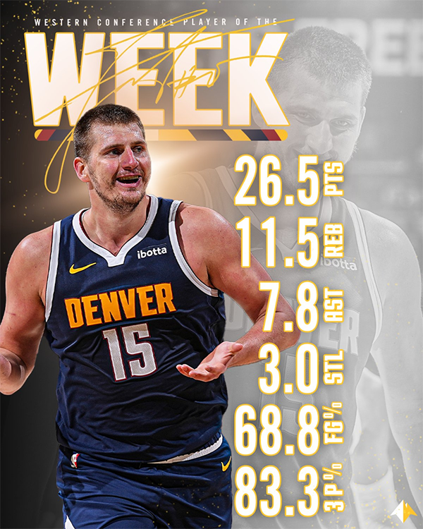 约基奇上周场均26.5分11.5篮板7.8助攻3抢断,投篮命中率68.8%,三分命中率83.3%,罚球命中率68.4%,率领掘金获得3胜1负的战绩。掘金官方晒海报祝贺约基奇获奖。