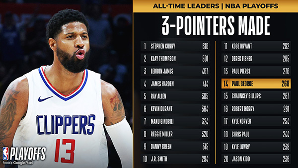 2、乔治三分命中数超越昌西-比卢普斯升到历史季后赛三分榜第14位