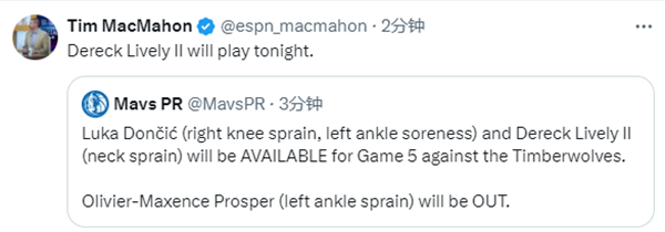 24直播网讯 北京时间5月31日,东契奇(右膝扭伤和左脚踝酸痛)继续带伤出战;独行侠迎来晋级总决赛的一大利好,球队中锋莱夫利确定复出,驰援东契奇和欧文冲击总决赛。