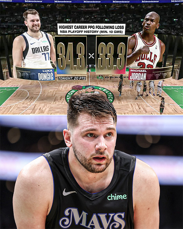 东契奇早早拿到20分,转播方插播东契奇在季后赛输球后下一场场均狂砍34.3分,如此数据超越乔丹排在历史之首(至少出战10场比赛)。