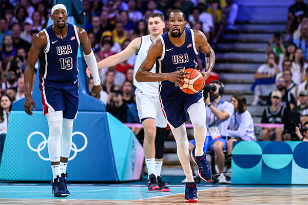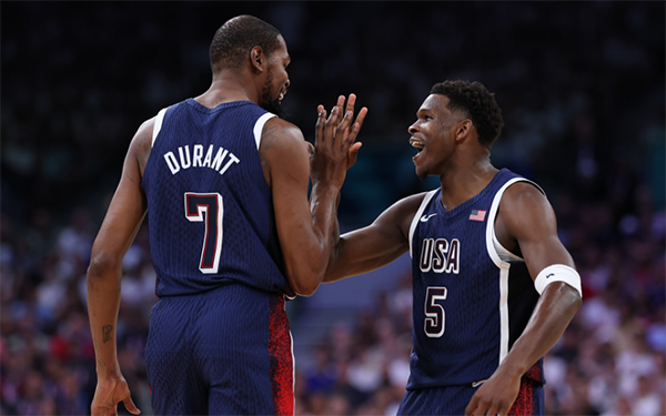 24直播网讯 北京时间7月28日,巴黎奥运男篮小组赛美国男篮对阵塞尔维亚,国际赛场大杀器杜兰特正式复出,上半场替补上场8分钟,8投8中独砍21分,死神挥舞镰刀弹无虚发,咧嘴大笑打开心了,第二节5中5独砍15分,强得离谱,正负值+17。