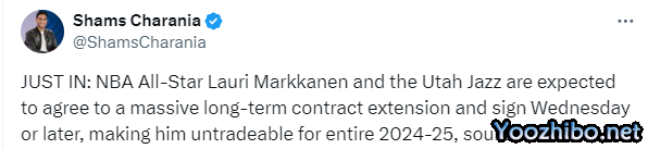 勇士追求马尔卡宁的希望破灭,据Shams、爵士记者Tony Jones和勇士记者Anthony Slater联合报道,马尔卡宁预计近期(8月8日或之后)将和爵士提前续约,双方即将签下一份巨额长约,这会导致他整个2024-25赛季都无法被交易。