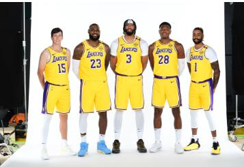 湖人五员大将合影,詹姆斯、浓眉、里夫斯、八村垒和拉塞尔一起拍摄定妆照,浓眉站在C位;据此前雷迪克透露,他们就是湖人新赛季的首发五虎。