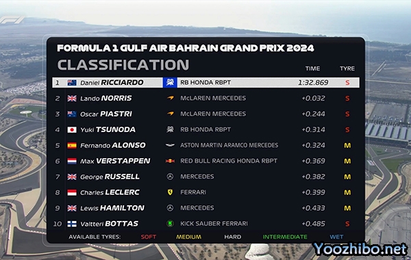 最终里卡多凭借1:32.869的软胎成绩取得一练头名,迈凯伦车队诺里斯和皮亚斯特里包揽二三位。里卡多的队友角田裕毅使用软胎排在第四。周冠宇第15名。