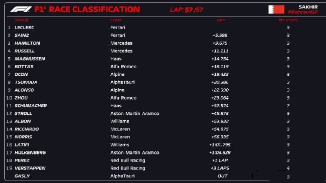 24直播网讯 北京时间3月21日凌晨,2022赛季F1揭幕战巴林大奖赛在萨基尔赛道结束正赛争夺。法拉利车队包揽前二,勒克莱尔率先冲线赢得个人第3个分站冠军,塞恩斯获得亚军,这也是法拉利车队自2019年新加坡站后首次一、二带回,汉密尔顿获得第三,世界冠军维斯塔潘在倒数第三圈因故障退赛,佩雷兹在最后一圈也出现问题未能完赛。中国车手周冠宇以第10名完赛,个人F1首秀便夺得一个积分。