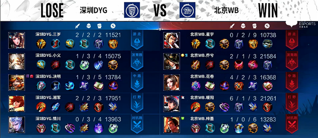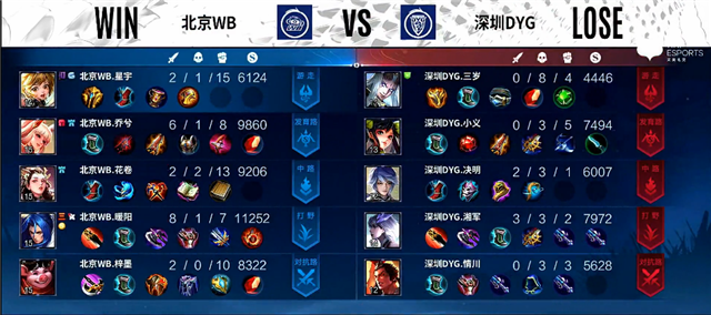 2分钟上路团战,鲁班大师拿下一血,马超拿下三杀。3分30秒阿古朵拿下暴君。4分10秒下路团战,兰陵王被击杀。4分30秒马超推掉上路一塔。5分21秒河道团战,深圳DYG打出0换2。5分50秒澜拿下主宰。6分20秒阿古朵拿下暴君。7分10秒河道团战,深圳DYG打出0换2。7分34秒虞姬推掉中路一塔。10分21秒暴君团,马超拿下双杀,澜拿下暴君。10分57秒马超拿下主宰。11分33秒狄仁杰推掉中路一塔。14分钟阿古朵拿下暴君。15分钟阿古朵拿下主宰。15分45秒狄仁杰推掉上路高地塔。17分钟阿古朵拿下暴君。18分27秒北京WB推掉中下两路高地塔,团战北京WB打出0换4。18分49秒北京WB推掉水晶率先拿下一分。