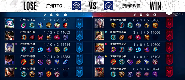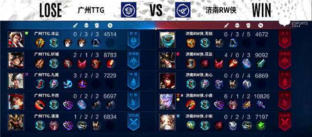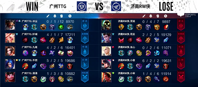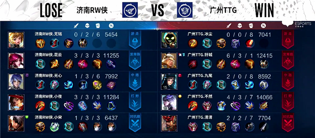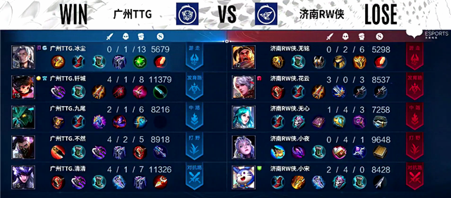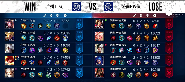双方和平开局。2分钟上路团战,橘右京拿下一血。2分20秒橘右京拿下暴君。3分10秒上路团战,橘右京被击杀。4分10秒下路团战,牛魔被击杀。4分45秒娜可露露拿下主宰。6分10秒橘右京推掉上路一塔。7分钟暴君团,橘右京被击杀。7分37秒广州TTG上路一塔被破。7分50秒娜可露露拿下暴君。9分10秒橘右京拿下主宰。10分10秒河道团战,广州TTG打出0换2。10分20秒娜可露露拿下主宰,公孙离推掉中路一塔和二塔,橘右京拿下暴君。12分20秒野区团战,太乙真人被击杀。15分07秒橘右京拿下暴君。16分20秒公孙离拿下主宰。16分40秒橘右京推掉上路高地塔。19分20秒橘右京拿下暴君。19分30秒河道团战,济南RW侠打出0换2。20分20秒娜可露露拿下风暴龙王。20分35秒中路团战,广州TTG打出0换2。21分20秒广州TTG推掉中路高地塔。25分10秒风暴龙王团,广州TTG打出1换4。26分04秒广州TTG推掉水晶率先拿下一分。