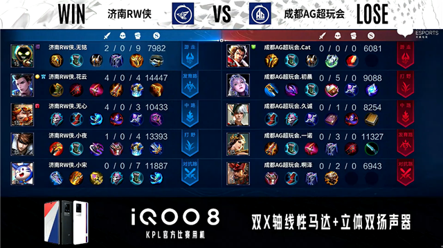 双方常规开局。1分48秒成都AG暴君处击杀弈星拿到一血。2分19秒成都AG拿下主宰。3分30秒暴君处团战成都AG打出0换4。4分06秒成都AG摧毁敌方中路外塔。4分40秒成都AG拿下暴君。5分10秒对抗路双方1换1。6分40秒成都AG拿下主宰。7分13秒济南RW侠对抗路打出0换2。8分54秒成都AG拿下暴君。10分15秒成都AG拿下暗影主宰。10分57秒济南RW侠中路击杀嫦娥。11分40秒中路团战成都AG打出1换2。12分36秒成都AG拿下暗影暴君。13分30秒成都AG摧毁敌方发育路高地塔。14分40秒成都AG拿下暗影主宰。16分21秒成都AG摧毁敌方对抗路高地塔。17分03秒成都AG拿下暗影暴君。18分12秒中路团战成都AG打出1换3。18分43秒成都AG超玩会摧毁敌方水晶拿下比赛。