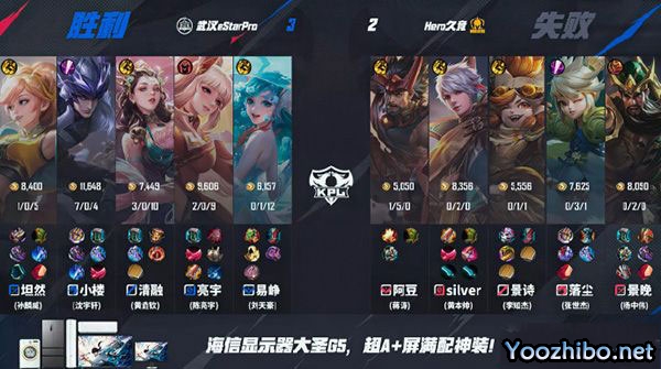 第二局,这局仿佛看到了上一局,Hero野射先掉,经济差拉开,eStar多消耗打爆发的阵容就很好发挥;决胜团亮宇的孙尚香装备成型拿到三杀,先到赛点!本局MVP为eStarPro小楼(沈宇轩)裴擒虎!