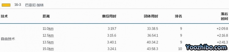 巴亚尼-加林接棒,轮到使用自由技术,最终她滑过15公里计时点团体共用时43分58秒3,落后第一名2分56秒4,排名第10。