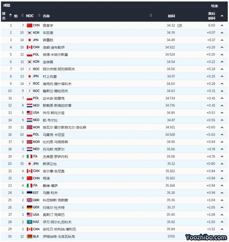 韩国选手车旼奎以34秒39的成绩获得银牌,日本选手森重航(34秒49)拿到铜牌。