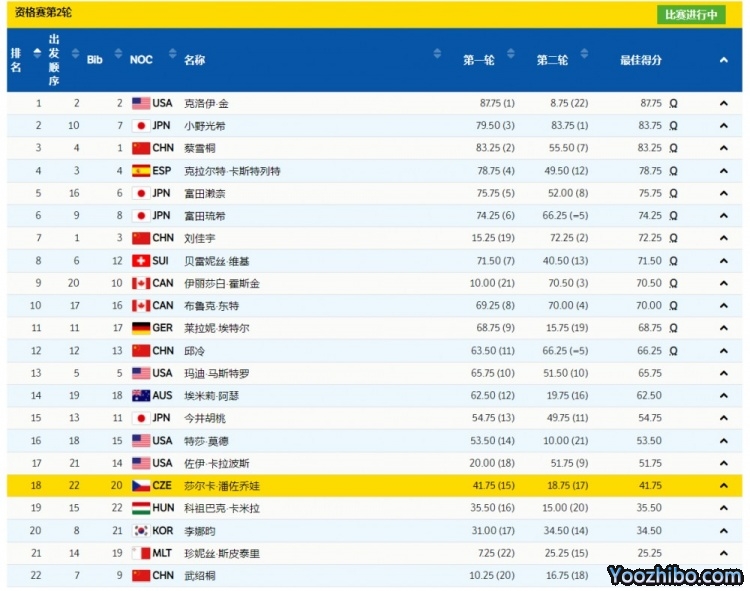 而日本天才选手小野光希则得到了79.50分排名第三,其他几名中国选手,第7个出场的武绍桐拿到10.25分,排在第20位,而第12个出场的邱冷拿到63.50分,排名第11。