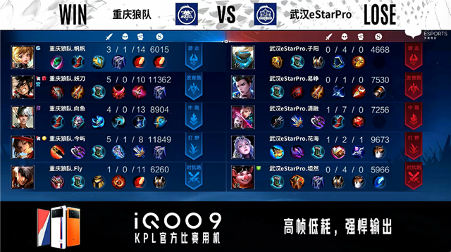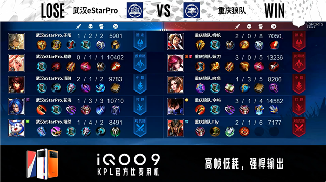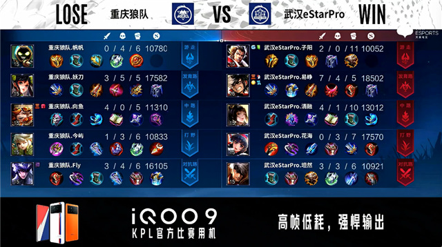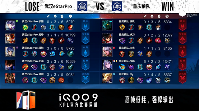开局武汉eStar对抗路、中路换线。2分59秒武汉eStar拿下暴君并击杀橘右京拿到一血。3分34秒发育路双方2换2。4分09秒武汉eStar中路击杀金蝉。4分25秒野区团战重庆狼队打出1换2。4分48秒武汉eStar摧毁敌方发育路外塔。5分01秒重庆狼队中路击杀吕布。6分06秒武汉eStar中路击杀瑶。10分46秒重庆狼队拿下暗影暴君,武汉eStar拿下暗影主宰。11分07秒重庆狼队中路击杀不知火舞。11分46秒重庆狼队摧毁敌方中路外塔。13分08秒重庆狼队主宰处击杀不知火舞。13分25秒重庆狼队摧毁敌方中路二塔。14分33秒重庆狼队拿下暗影暴君,团战双方2换2。15分32秒武汉eStar摧毁中路外塔。15分41秒武汉eStar拿下暗影主宰,团战重庆狼队打出0换2。18分35秒武汉eStar拿下暗影暴君。19分10秒对抗路团战武汉eStar打出2换4。19分46秒武汉eStar团灭对手摧毁水晶拿下比赛。