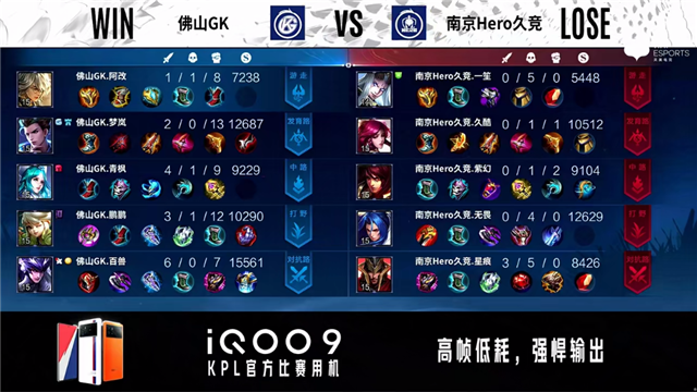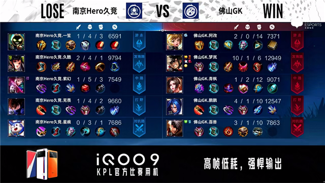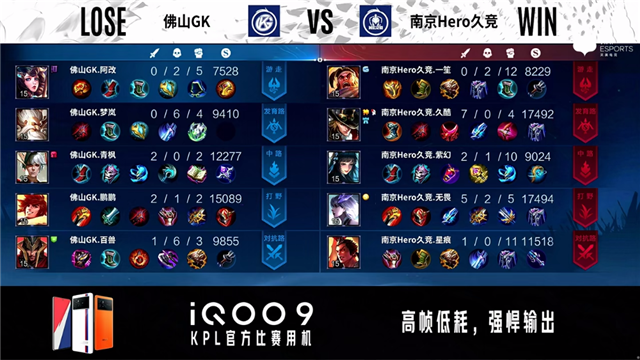 58秒,佛山GK裴擒虎击杀西施拿下一血。1分57秒,下路团,双方1换1。2分51秒,佛山GK击杀苏烈。4分02秒,佛山GK破掉南京Hero久竞下一塔,随后南京Hero久竞控下先知主宰。5分08秒,佛山GK破掉南京Hero久竞上一塔。5分38秒,南京Hero久竞击杀蒙恬,随后佛山GK破掉南京Hero久竞上二塔。6分25秒,南京Hero久竞击杀入侵野区的老夫子。7分45秒,佛山GK破掉南京Hero久竞中一塔。8分01秒,南京Hero久竞控下暴君。8分24秒,佛山GK控下先知主宰。9分20秒,双方团,南京Hero久竞打出0换2。10分28秒,南京Hero久竞控下暗影主宰,随后团战双方1换1。11分钟,南京Hero久竞镜抢到暗影暴君。12分58秒,南京Hero久竞破掉佛山GK上二塔,随后佛山GK大乔传大破掉南京Hero久竞下高地。13分29秒,南京Hero久竞破掉佛山GK中二塔。13分53秒,双方团战1换1。14分36秒,南京Hero久竞西施抢到暗影主宰。15分46秒,佛山GK大乔传大强推掉南京Hero久竞上高地,随后南京Hero久竞控下暗影暴君。16分44秒,南京Hero久竞破掉佛山GK下二塔。12分钟,南京Hero久竞击杀蒙恬。18分24秒,中路团,南京Hero久竞打出0换2,随后控下暗影主宰。19分钟,南京Hero久竞破掉佛山GK中高地。20分13秒,双方团,南京Hero久竞打出0换3。21分01秒,南京Hero久竞摧毁佛山GK水晶扳回一城。