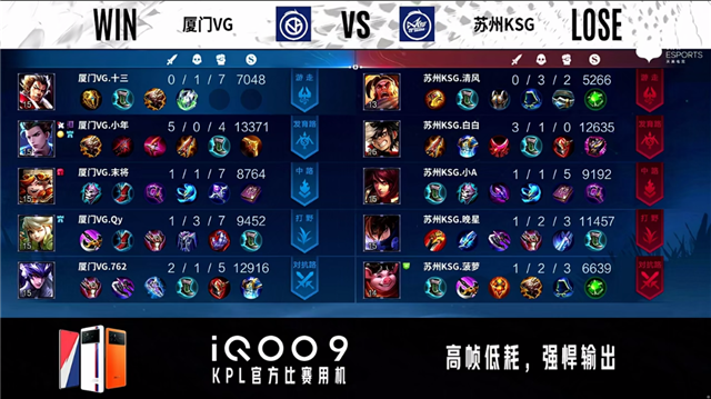 2分10秒,苏州KSG伽罗击杀东皇太一拿下一血。2分27秒,苏州KSG控下暴君。3分39秒,厦门VG橘右京击杀吕布,随后关羽再击杀娜可露露。4分45秒,双方团,苏州KSG打出0换2。5分10秒,苏州KSG吕布下路击杀关羽。6分50秒,苏州KSG控下暴君,随后破掉厦门VG下一塔。8分47秒,中路团,苏州KSG击杀弈星,随后控下先知主宰。9分17秒,苏州KSG破掉厦门VG上一塔。10分20秒,厦门VG橘右京抢到暗影暴君。11分48秒,厦门VG击杀娜可露露,随后破掉苏州KSG上二塔。12分06秒,厦门VG控下暗影主宰。12分15秒,厦门VG破掉苏州KSG中一塔。13分16秒,双方团,厦门VG打出1换2。13分57秒,厦门VG破掉苏州KSG中二塔。15分43秒,双方团战1换1,厦门VG破掉苏州KSG下二塔。16分17秒,厦门VG控下暗影暴君。17分20秒,厦门VG破掉苏州KSG上高地。17分58秒,厦门VG击杀吕布。18分30秒,厦门VG破掉苏州KSG下高地。18分45秒,厦门VG控下暗影暴君。19分45秒,双方团战4换4。21分47秒,双方团,苏州KSG打出1换2。23分20秒,双方团,厦门VG打出2换5团灭对手。23分50秒,厦门VG中路一波摧毁苏州KSG水晶赢下比赛。
