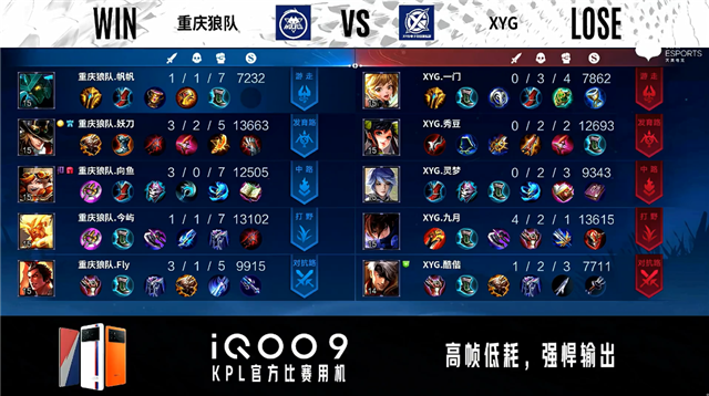 重庆狼队开局边路换线。1分05秒XYG野区击杀裴擒虎拿到一血。2分12秒XYG拿下暴君。3分39秒XYG对抗路击杀李元芳。3分57秒XYG对抗路击杀嬴政。4分04秒重庆狼队发育路击杀东皇太一。4分14秒XYG拿下主宰。5分06秒双方发育路1换1。5分40秒重庆狼队摧毁敌方发育路外塔。6分30秒XYG拿下暴君。6分48秒重庆狼队摧毁敌方对抗路外塔。7分12秒XYG摧毁敌方中路外塔。8分28秒中路团战XYG打出0换3。6分56秒XYG摧毁敌方中路二塔。10分10秒XYG拿下暗影暴君。10分52秒XYG拿下暗影主宰。13分55秒XYG拿下暗影暴君。14分44秒XYG拿下暗影主宰。15分36秒XYG摧毁敌方中路高地塔。17分10秒对抗路团战XYG打出0换2。18分36秒XYG拿下暗影主宰。19分11秒XYG摧毁敌方发育路高地塔。19分48秒XYG摧毁敌方对抗路高地塔。21分05秒XYG拿下风暴龙王。22分03秒XYG摧毁敌方水晶拿下比赛。