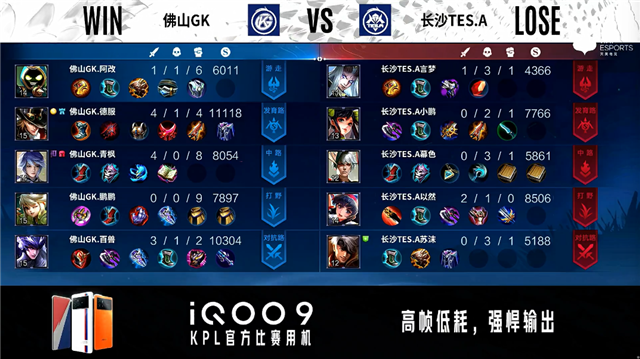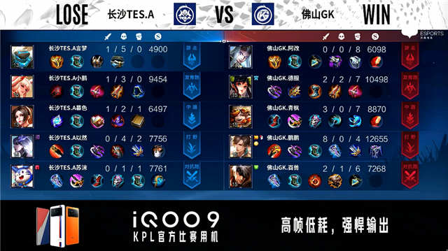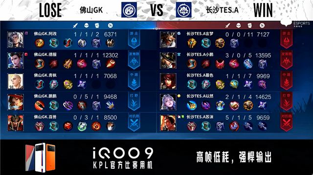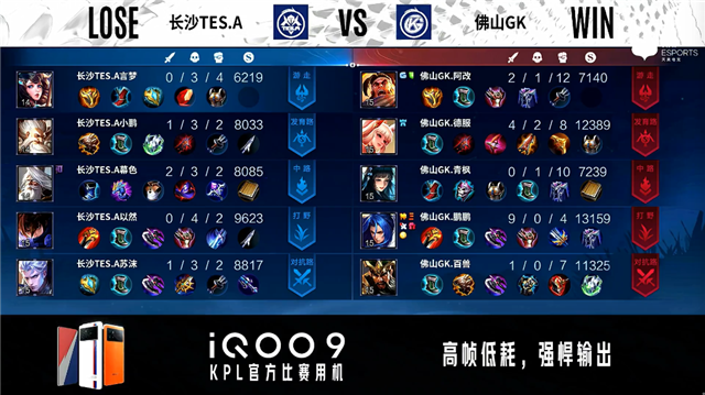 双方常规开局。1分35秒长沙TES.A野区击杀云缨拿到一血。1分42秒佛山GK中路击杀周瑜。2分13秒长沙TES.A中路击杀云缨。5分19秒长沙TES.A拿下主宰。5分29秒佛山GK摧毁敌方发育路外塔。6分58秒佛山GK发育路击杀露娜。8分15秒长沙TES.A中路击杀云缨。9分40秒长沙TES.A拿下主宰。10分27秒长沙TES.A发育路击杀蒙恬。11分28秒长沙TES.A对抗路击杀蒙恬。11分52秒长沙TES.A摧毁敌方对抗路二塔。12分17秒长沙TES.A摧毁敌方发育路二塔。12分50秒发育路团战双方1换1,长沙TES.A摧毁敌方发育路高地塔。13分59秒长沙TES.A拿下暗影暴君。14分54秒长沙TES.A拿下暗影主宰。17分08秒长沙TES.A对抗路打出0换5。17分22秒长沙TES.A摧毁敌方水晶拿下比赛。