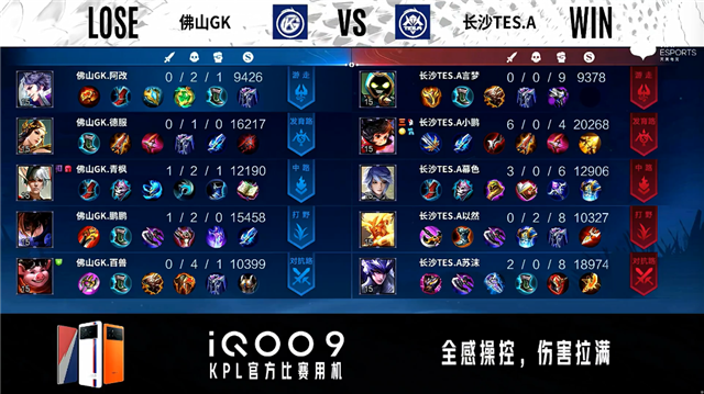 双方常规开局。1分21秒佛山GK中路击杀姜子牙拿到一血。2分16秒佛山GK拿下暴君。3分09秒发育路团战长沙TES.A打出1换2。4分07秒发育路团战佛山GK打出0换5并摧毁发育路外塔。5分10秒野区团战佛山GK打出0换2。5分44秒佛山GK拿下暗影主宰。5分50秒佛山GK摧毁敌方对抗路外塔。6分43秒佛山GK摧毁敌方中路外塔。7分35秒佛山GK拿下暴君。8分40秒野区团战佛山GK打出1换2。9分30秒佛山GK对抗路击杀大乔。10分16秒佛山GK拿下暗影主宰。10分38秒佛山GK摧毁敌方发育路二塔。11分24秒佛山GK摧毁敌方中路二塔。11分47秒佛山GK摧毁敌方对抗路二塔。12分08秒佛山GK摧毁敌方对抗路高地塔。12分36秒佛山GK拿下暗影暴君。14分05秒佛山GK拿下暗影主宰。15分06秒佛山GK摧毁敌方中路高地塔。15分16秒高地团战佛山GK打出1换4,橘右京拿到三连决胜。15分37秒佛山GK摧毁敌方水晶拿下比赛。