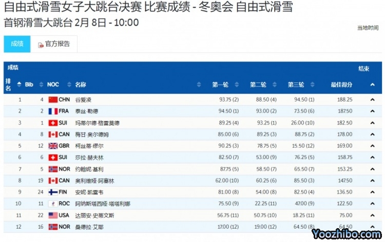 决赛中,出场的12名选手仍旧是以2轮最好成绩相加,决出最终的名次,备受瞩目的中国名将谷爱凌排在第八个出场。