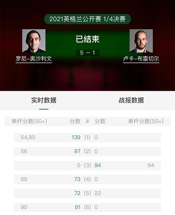 24直播网讯北京时间11月06日,英格兰公开赛1/4决赛,奥沙利文5-1绅士横扫布雷切尔晋级4强。比赛伊始奥沙利文便火力全开,仅用时8分钟便完成连续两杆50+,单局139-0布雷切尔气吞山河。而布雷切尔显然对于火箭开场操作打懵,第二局再次防守不到位,奥沙利文再添单杆56分2-0领先。前两局轻松获胜的火箭稍有放松,第三局小角度拼中袋不中漏下绝佳机会,平静呼吸的布雷切尔轰出单杆94分还以颜色。随后布雷切尔又一次第一杆便漏球,火箭一杆致命3-1进入中场休息。下半场布雷切尔一杆超级大翻袋上手,但随后再次失误送机会,奥沙利文围球33分后贴库红球不中留下袋口,面对大好球形“比利时子弹”再次薄球失误,奥沙利文接管一杆制胜拿到赛点。大比分落后的布雷切尔没了心气,奥沙利文乘胜追击5-1大胜布雷切尔。