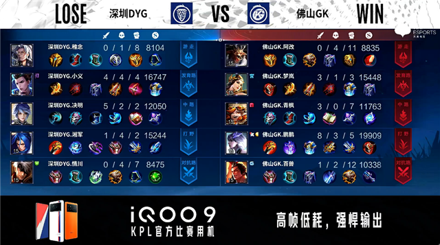 开局深圳DYG中路、发育路换线。1分整佛山GK主宰处击杀吕布拿到一血。1分29秒深圳DYG对抗路打出1换2。3分33秒佛山GK对抗路击杀橘右京。4分11秒佛山GK拿下暴君。5分52秒佛山GK发育路击杀狄仁杰。7分24秒深圳DYG野区击杀镜。10分18秒中路团战佛山GK打出0换2。11分58秒佛山GK拿下暗影暴君。12分11秒佛山GK发育路击杀橘右京。12分22秒佛山GK摧毁敌方中路二塔。12分51秒双方中路1换1,佛山GK摧毁敌方中路高地塔。13分36秒暴君处团战佛山GK击杀狄仁杰。13分59秒佛山GK发育路击杀橘右京。14分30秒深圳DYG发育路击杀虞姬。17分49秒高地团战佛山GK打出0换2。18分31秒高地团战佛山GK打出1换2。20分53秒佛山GK拿下风暴龙王。22分27秒佛山GK摧毁敌方水晶拿下比赛。