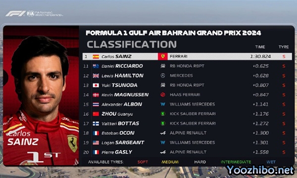 24直播网讯 北京时间03月01日,2024F1巴林大奖赛第三次练习赛,塞恩斯凭借1:30.824的成绩取得三练头名,阿隆索落后0.141秒排名第二,维斯塔潘第三。