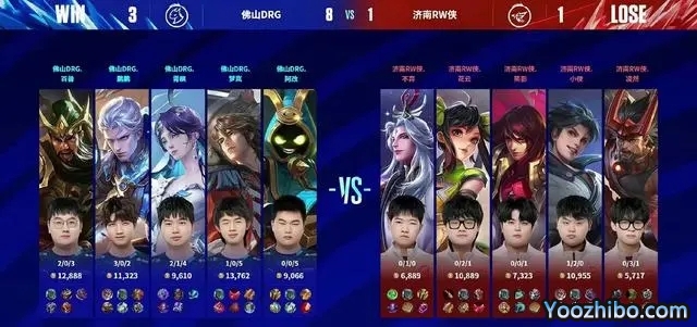 第一局,济南RW侠蓝色方,拿到了露娜+鲁班七号。佛山DRG红色方,拿到了娜可露露+虞姬。开局济南RW侠击杀王昭君,拿下一血。9分钟中路,佛山DRG野辅配合击杀露娜。12分钟,佛山DRG直推中路一塔,击杀对面双边,经济差拉开三千。决胜团,佛山DRG虞姬先手点杀露娜,一波团灭济南RW侠,直推水晶,先下一局。