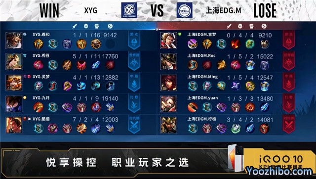 双方常规开局。2分15秒XYG拿下暴君。3分30秒XYG中路击杀周瑜拿到一血。4分07秒XYG发育路击杀马可波罗。5分21秒上海EDG.M拿下主宰。5分35秒XYG对抗路击杀马可波罗。7分14秒上海EDG.M中路击杀吕布。8分50秒野区团战XYG野区打出0换2。8分07秒XYG澜野区单杀马可波罗。9分22秒XYG对抗路打出0换2。9分34秒上海EDG.M野区击杀沈梦溪。11分24秒中路团战XYG击杀关羽。11分37秒上海EDG.M摧毁敌方中路二塔。13分18秒高地团战双方1换1。15分11秒高地团战XYG打出0换2。15分57秒XYG对抗路打出0换2。16分36秒XYG摧毁敌方对抗路、中路高地塔。16分59秒XYG拿下暗影主宰。18分09秒高地团战双方1换1。22分22秒XYG拿下风暴龙王,团战XYG打出2换5。22分59秒XYG摧毁敌方水晶拿下比赛。